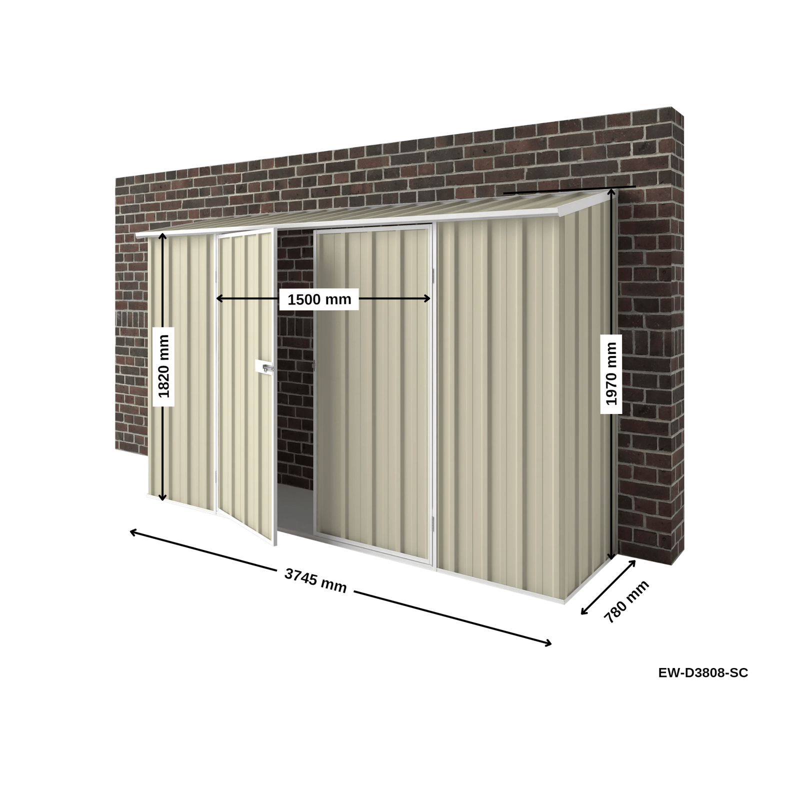 This off-the-wall storage shed is ideal to be used as a courtyard garden storage in denser inner city living, townhouses and homes where storage is important, but space is limited. This 3.75m x 0.78m x 1.80/1.95m Off-the-Wall compact storage shed is a great addition to anyone’s exterior wall being the perfect space to store anything from lawn mowers, tools, ladders, sports equipment or garden tools. With the 1.50m hinged double doors this shed is great for storing those larger items where that extra room is needed. The door is braced to ensure the integrity of your shed structure and is designed to allow easy access to your shed’s contents. Our door locks use a pad bolt and hasp, which is a secure form of locking. You can add a padlock to the door for added security at your own discretion.