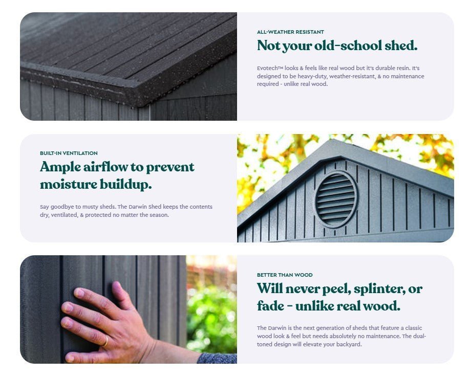 The evolutionary Darwin composite shed is the perfect design if you desire the look of a wooden shed but with all the benefits of resin. The Darwin 6 X 4 is the ultimate in patio and garden storage. Forget hoping something will fit, with double doors and an incredibly spacious interior, you know it will. Store your garden tools, gardening equipment, outdoor furniture and much more safely and securely with the added lockable hasp. The Darwin 6 X 4’s metal reinforced double walled tongue and groove construction is incredibly strong and rigid, and includes practical touches like a vent for air circulation to prevent moisture build up and a window and skylight for a well-lit interior.