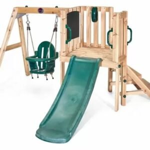 Transform your outdoor space into a magical learning environment with the Plum Discovery Woodland Treehouse. This charming wooden treehouse stands at 193 centimetres tall and features a robust climbing wall and slide that encourages active play and physical development. The built-in potted planter area lets children discover the joys of gardening, complete with specially designed tools and a clever pail and pull system for plant care. Little ones can express their creativity on the easy-clean painting screen, using the included paintbrush pens and mixing pots. The gentle sounds of bamboo wind chimes add a soothing element to playtime. Crafted from certified wood, this treehouse combines adventure and learning with its 112 x 112 centimetre deck that supports up to 50 kilograms. Assembly requires approximately 4 hours with two adults, using basic tools. The treehouse arrives in 7 boxes and includes everything needed for endless outdoor adventures. Watch as children develop their physical abilities, nurture plants, and engage with the natural world in this versatile play space that brings joy throughout the changing seasons.