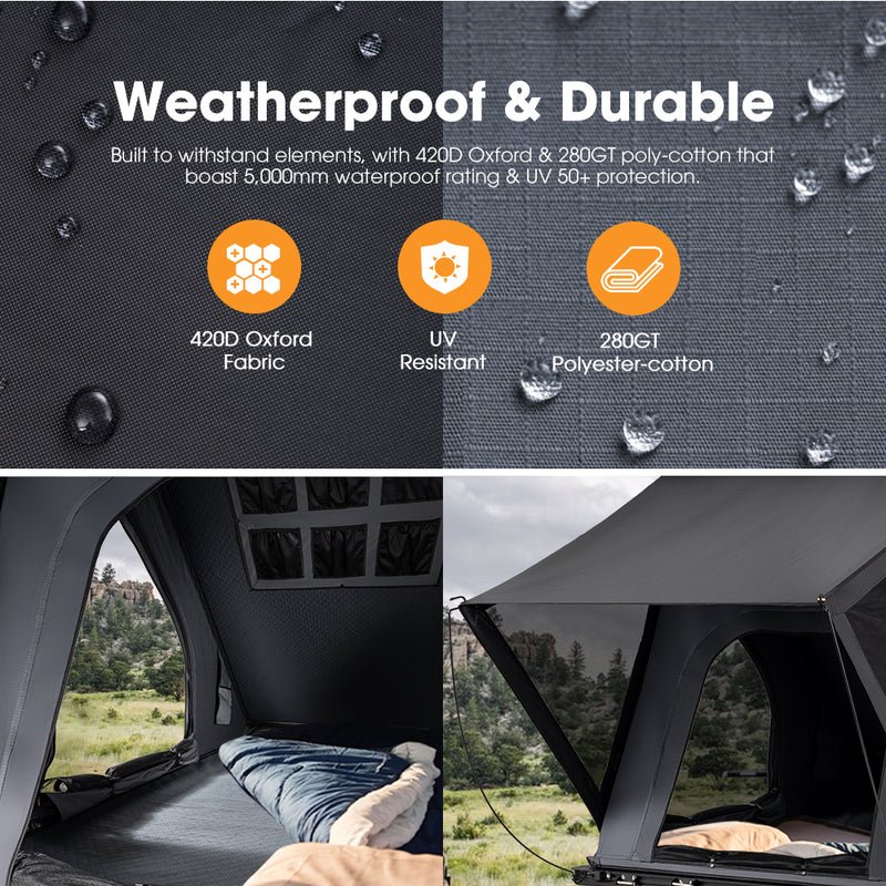 Inside, the tent offers comfortable sleeping space that accommodates two adults, with well‑ventilated mesh panels and durable, weather‑resistant fabric to balance airflow and protection. Whether you’re camping in summer breezes or cool nights, this rooftop tent gives you a cozy and elevated base camp off the ground.